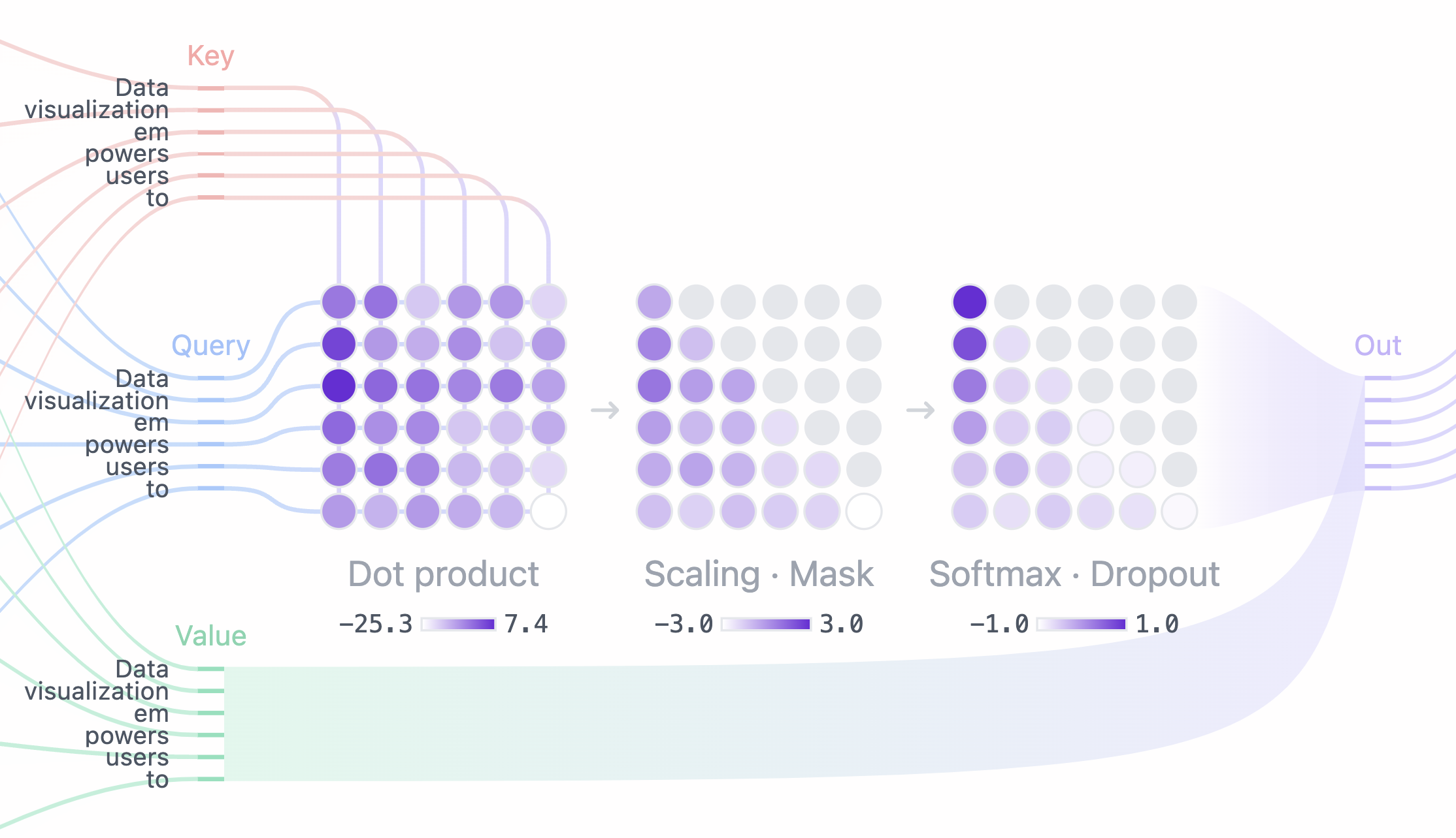 • Softmax: After masking, the attention score is converted into probability by the softmax operation which takes the exponent of each attention score. Each row of the matrix sums up to one and indicates the relevance of every other token to the left of it.